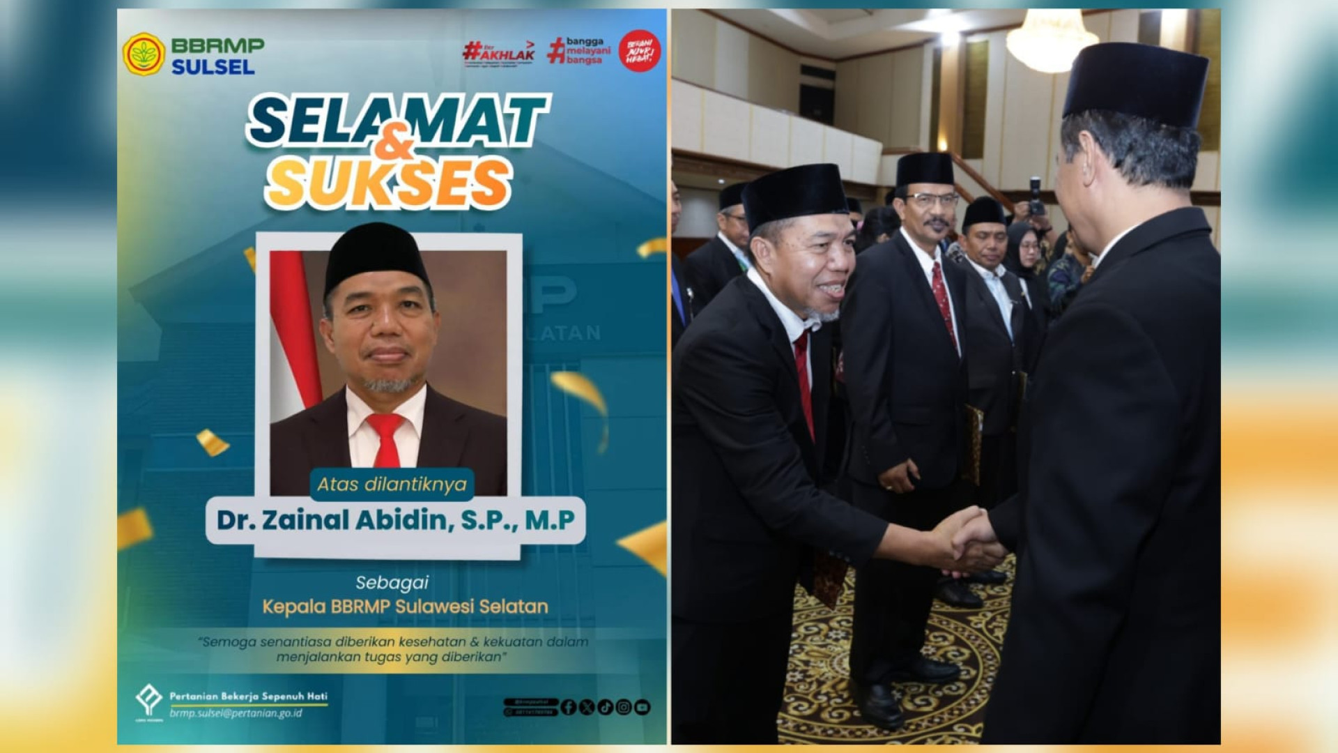 Segenap Keluarga Balai Besar Penerapan Modernisasi Pertanian Sulawesi Selatan mengucapkan Selamat dan Sukses atas dilantiknya Dr. Zainal Abidin, S.P., M.P sebagai Kepala Balai Besar Penerapan Modernisasi Pertanian Sulawesi Selatan