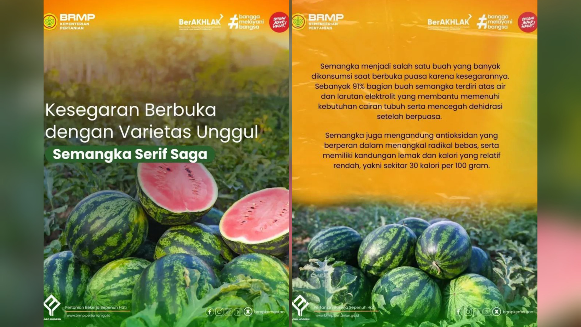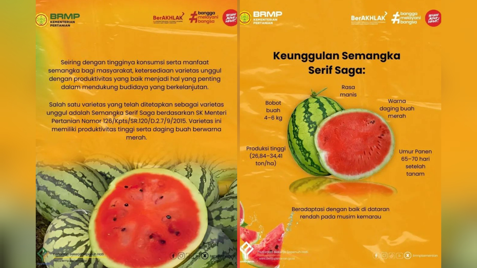 Salah satu varietas semangka yang dikembangkan Kementerian Pertanian adalah Semangka Serif Saga (Agrihorti). Dengan produktivitas yang tinggi dan daging buah berwarna merah, dapat menjadi pilihan untuk mendukung ketersediaan buah segar berkualitas