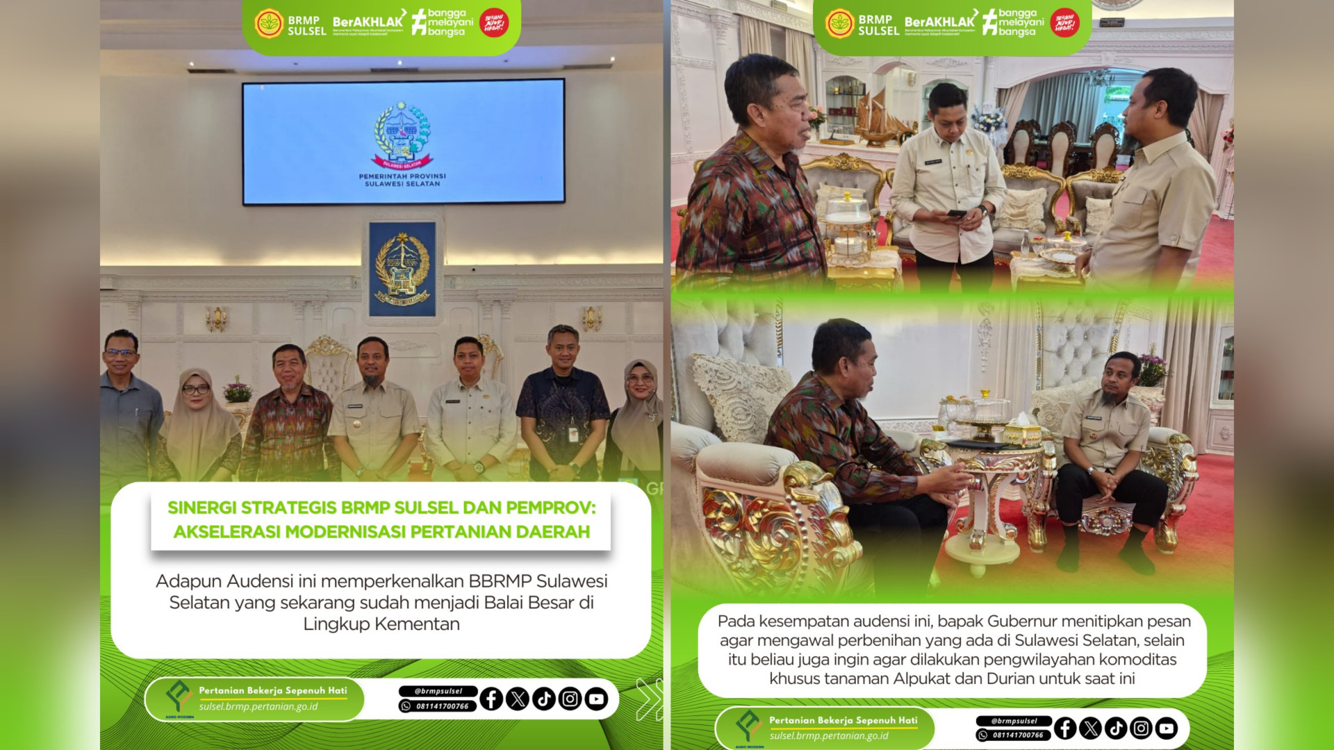 Pada kesempatan audiens ini, Gubernur menitipkan pesan agar mengawali perbenihan yang ada di Sulawesi Selatan selain itu beliau juga ingin agar dilakukan pengwilayahan komoditas khusus tanaman Alpukat dan Durian untuk saat ini